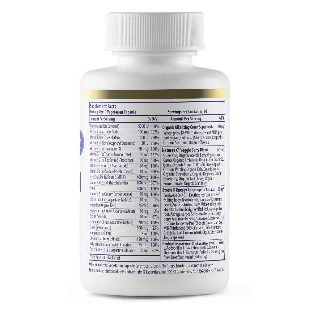Bursting with over 48 ingredients Paradise® award-winning ORAC-Energy® Earth’s Blend® is truly a Nature Synergized™ superfood multivitamin. Our formula uses real whole-food goodness paired with with enzymatically active methylated vitamins to go beyond mere deficiencies and help support overall whole system health. It’s not just how many ingredients are in your multiple, its what it can do that makes the difference. Earth’s Blend is tested using state of the art technology to actually prove its powerful antioxidant activity. Each capsule is over 4,000 ORAC giving you the antioxidant power of over 7 servings of fruits and vegetables in every capsule, making it quite possibly (in our humble opinion) the best multivitamin on the PLANET!